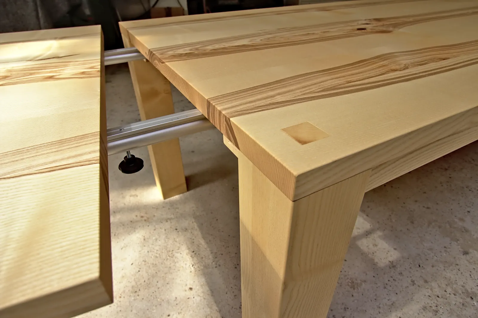 Handwerkliche Details wie Zierzapfen in der Platte oder die werkzeuglose Befestigung der Ansteckplatten zeigen, wie viel Sorgfalt in der Planung und Umsetzung steckt. Ein Tisch, der nicht nur durch Material, sondern auch durch Präzision überzeugt.