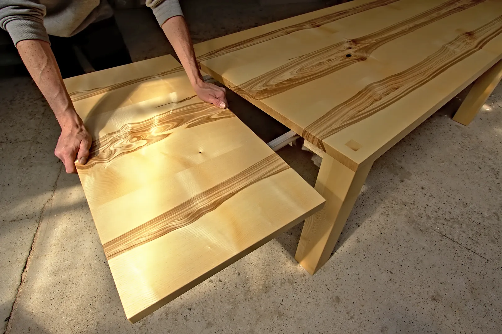 Kaum ein Holz besitzt eine so ausdrucksstarke Maserung wie die Olivkernesche. Die natürlichen Kontraste wirken wie mit breitem Pinsel gezogen und machen jede Tischplatte zum Unikat. Bei diesem Tisch wurde die durchgehende Maserung auch auf die beiden Ansteckplatten abgestimmt – für ein harmonisches Gesamtbild über die volle Länge hinweg.